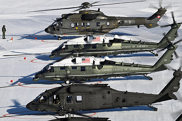 Vrtulníky na heliportu, zatímco se Donald Trump účastní 56. výročního Světového ekonomického fóra v Davosu. (21. ledna 2026)