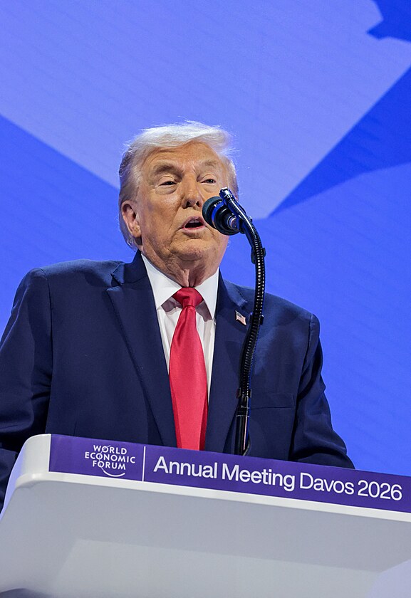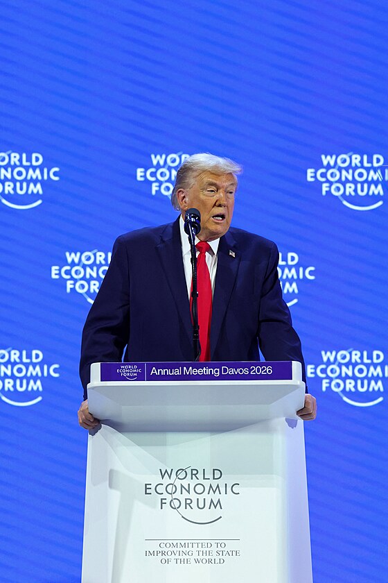 Donald Trump při projevu na 56. výročním zasedání Světového ekonomického fóra v Davosu. (21. ledna 2026)