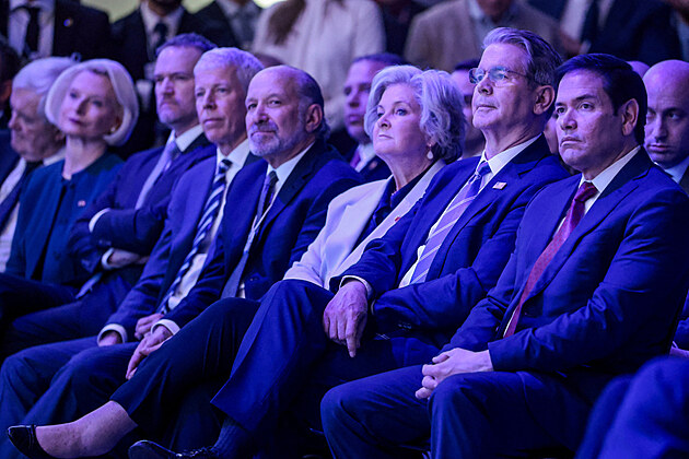 Americký ministr zahraničí Marco Rubio (uprostřed) sedí vedle ministra financí USA Scotta Bessenta (třetí zleva) a éfky personálu Bílého domu Susie Wilesové (druhá zleva) a poslouchá projev prezidenta Donalda Trumpa na zasedání Světového ekonomického fóra v Davosu (21. ledna 2026)