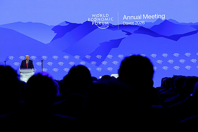 Účastníci poslouchají projev prezidenta Donalda Trumpa na zasedání Světového ekonomického fóra v Davosu. (21. ledna 2026)