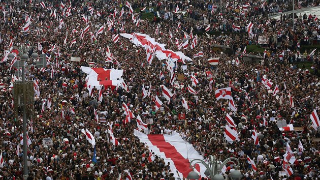 Dav s bílo-červenými vlajkami, které se staly barvami protestu, zaplnil minské náměstí Nezávislosti a přilehlé ulice a skandoval hesla jako „Odejdi!“, „Svoboda!“ či „Lukašenka do antona (vozu pro přepravu vězňů a zatčených)“, vylíčil reportér agentury AFP. Podle něj Lukašenko, který vládne 26 let, se ještě nikdy nestřetl s tak početným a vytrvalým odporem.