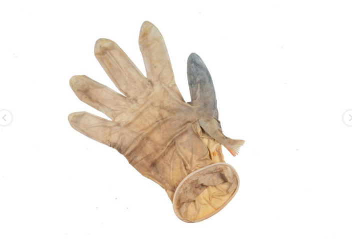 Ryba, která uvízla ve vyhozené hygienické latexové rukavici.