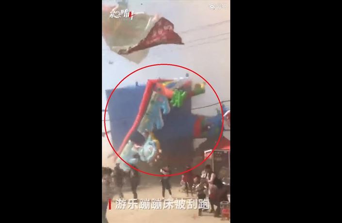 Na videu je vidět skákací hrad chycený ve vzdušném víru a pouliční prodavače, kteří se snaží udržet své stany na zemi. Komentátor poukazuje na deset lidí s viditelným zraněním. Většina z nich jsou děti.